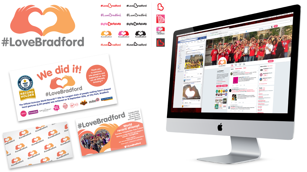 Brand creation for the Love Bradford Guinness World Record attempt. This was rolled out across a full range of digital formats including the Bradford big screen digital display and printed items including tshirts.