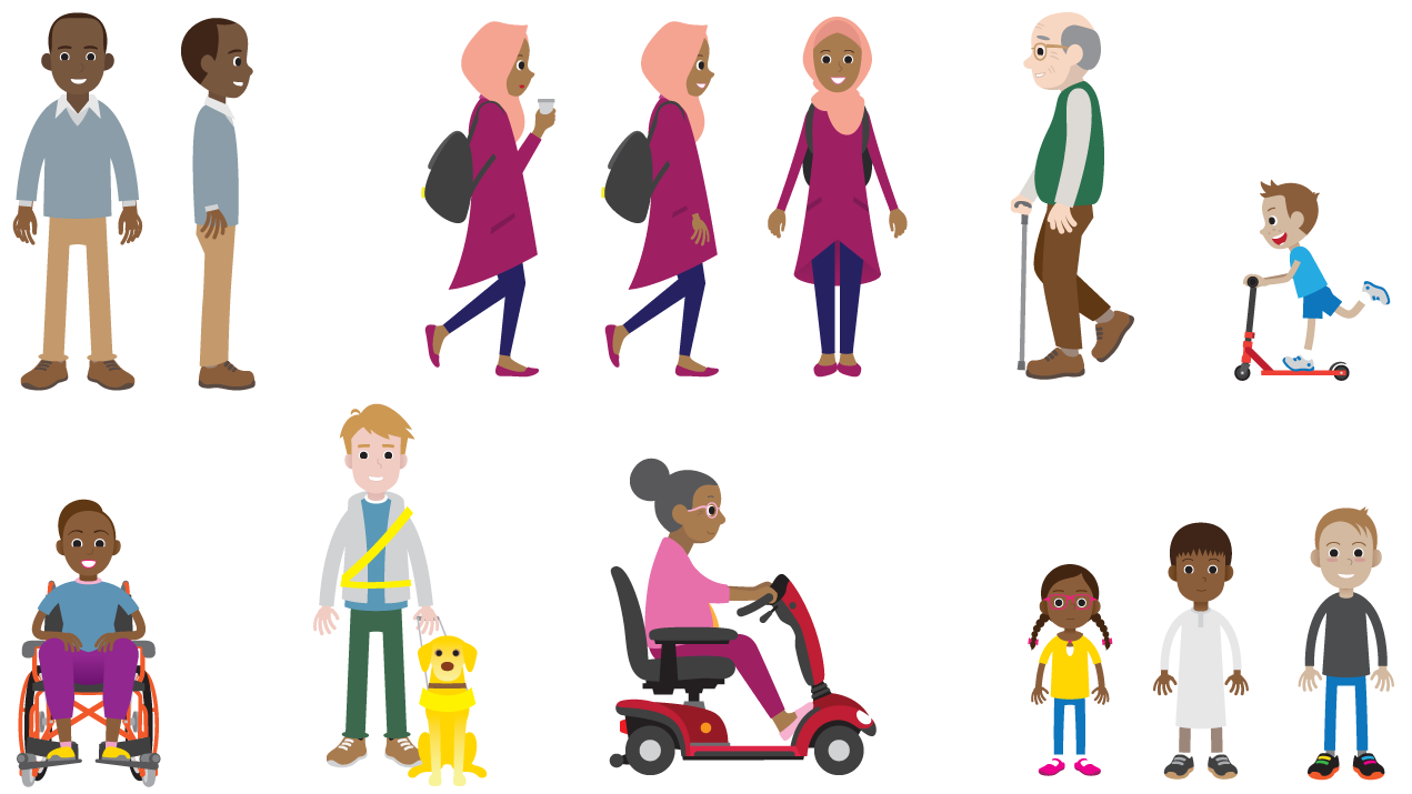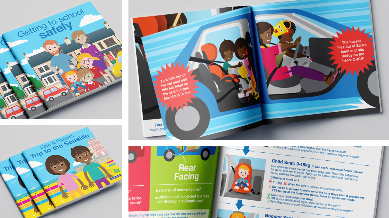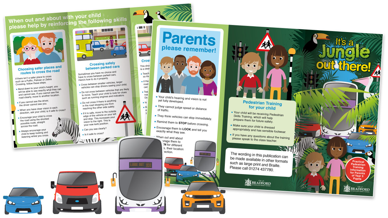 A second book was created giving advice on how to make journies by car safer too, as well as leaflets aimed at adults. A range of recognisable, everyday characters were created to depict different scenarios, reflecting the diversity of Bradford district's pedestrians and road users. All artwork was in vector format meaning elements could be repositioned and reused for different purposes including standees and magnetic boards for classroom exercises.